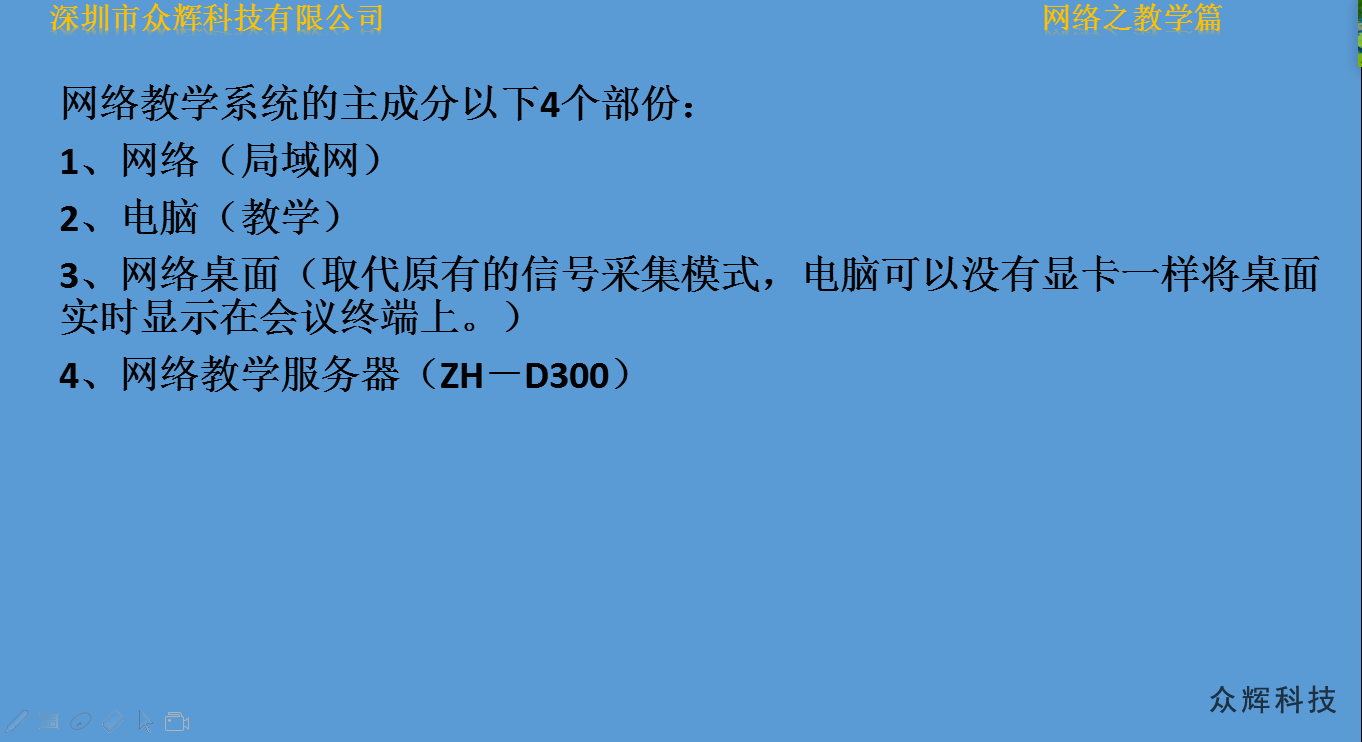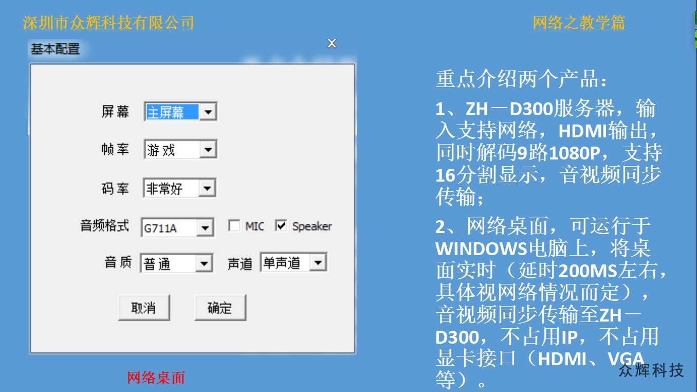 網(wǎng)絡(luò)桌面是我公司在WINDOWS系統(tǒng)上研發(fā)的一款電腦同屏軟件,只需要將電腦接入局域網(wǎng),即可完成音視頻同步在ZH-N3000(網(wǎng)絡(luò)拼接系列產(chǎn)品)、ZH-D300(網(wǎng)絡(luò)拼接處理器)和ZH-N230(網(wǎng)絡(luò)版電視拼接處理器)等設(shè)備上,實(shí)現(xiàn)液晶拼接大屏同步顯示。